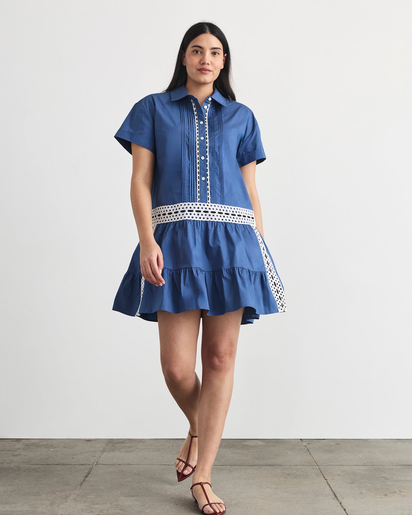 Featuring a button up v-neckline, on-seam pockets, eyelet detailing, and a flounced tiered skirt, Jasmine delivers a playful, feminine feel with everyday polish and effortless charm.