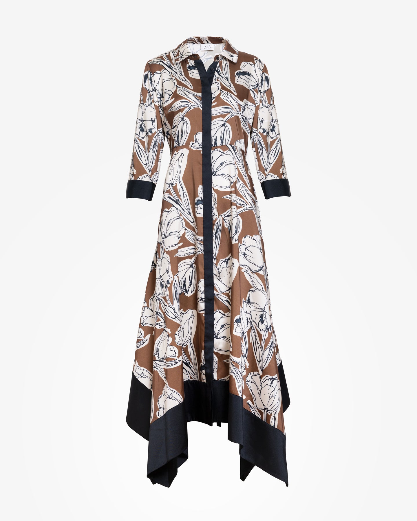 Featuring an elegant handkerchief hemline that falls elegantly, adjustable cuffed sleeves and collared v-neckline, the Selene Dress is a tailored approach to a classic shirt dress with feminine prep.