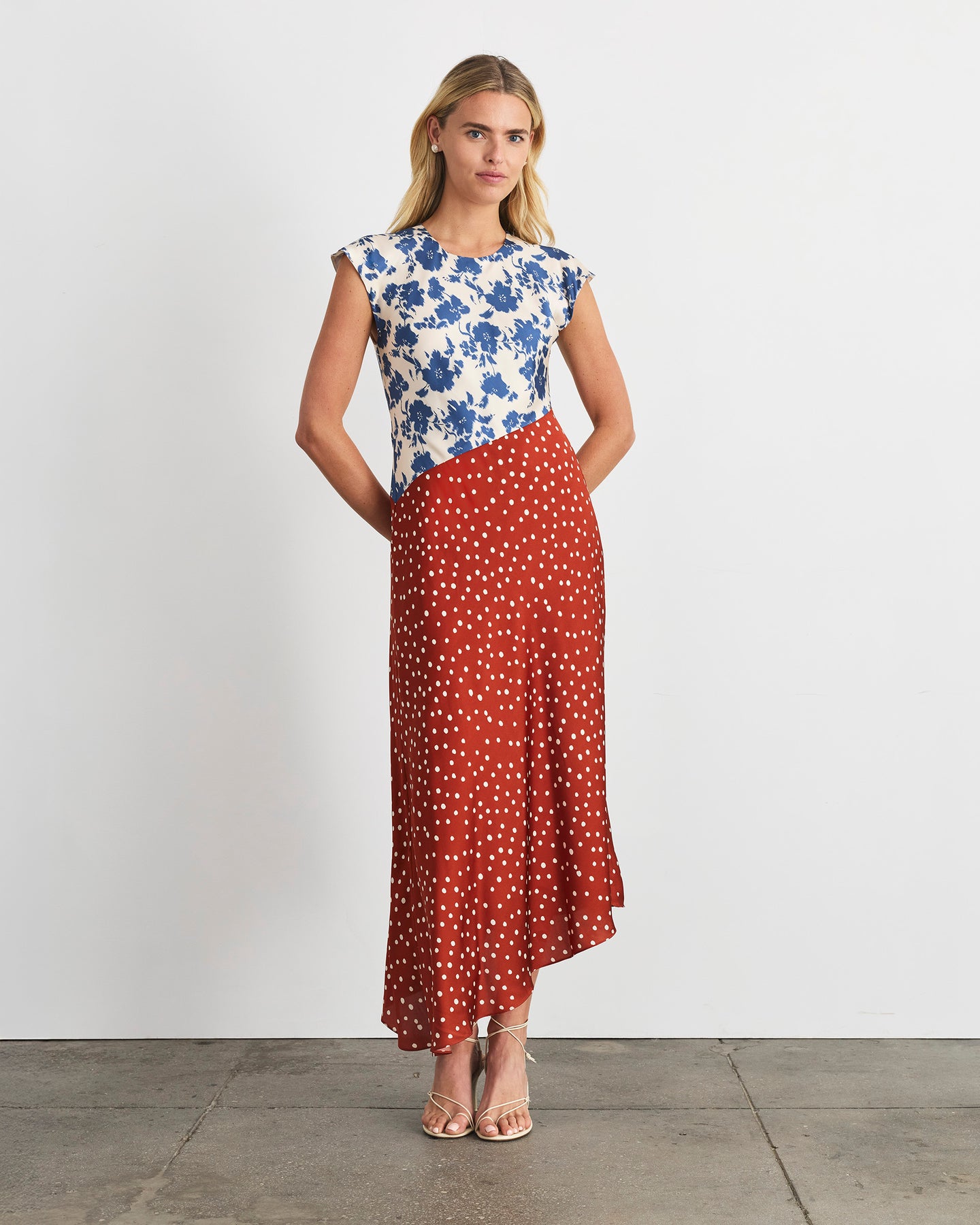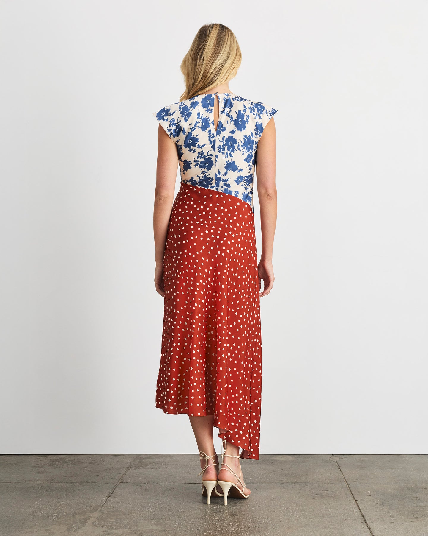 Crafted from a luxe stretch silk, this timeless silhouette features a romantic crew neckline with flutter sleeves and a graceful bias cut into an asymmetrical hem that flatters effortlessly.