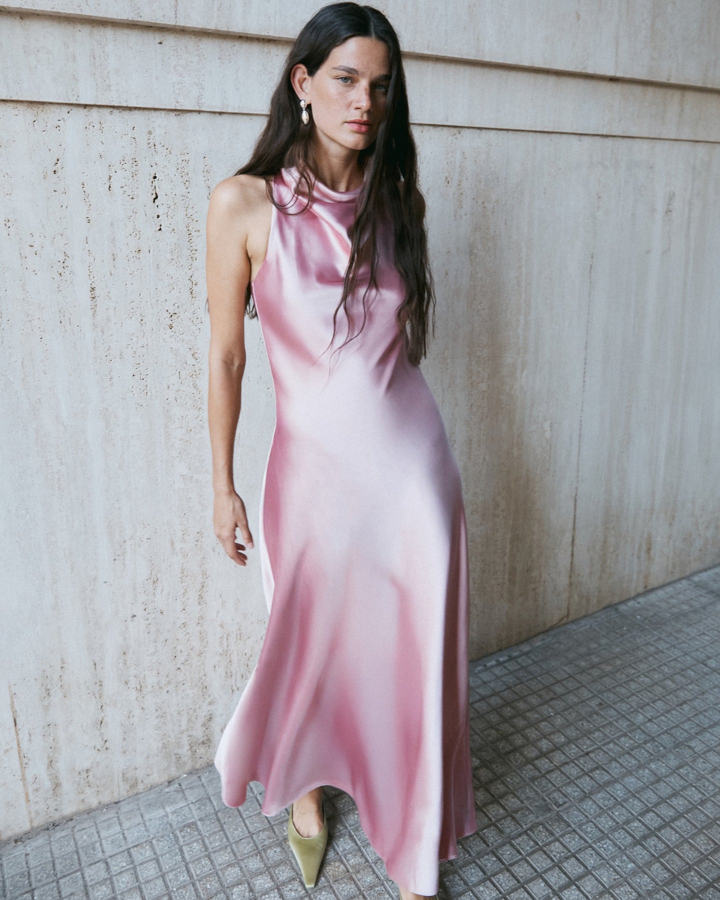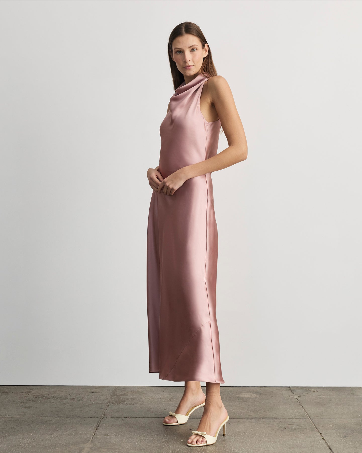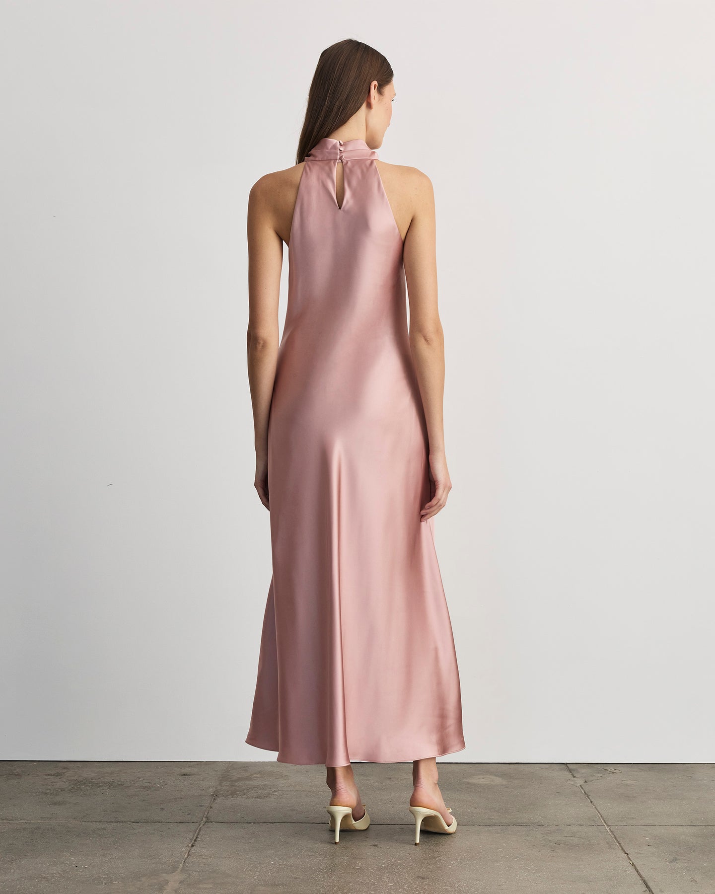 Designed in a soft-to-the-touch satin, Celinda features cascading folds on the halter neckline and a flattering bias-cut that glides across the room with you.