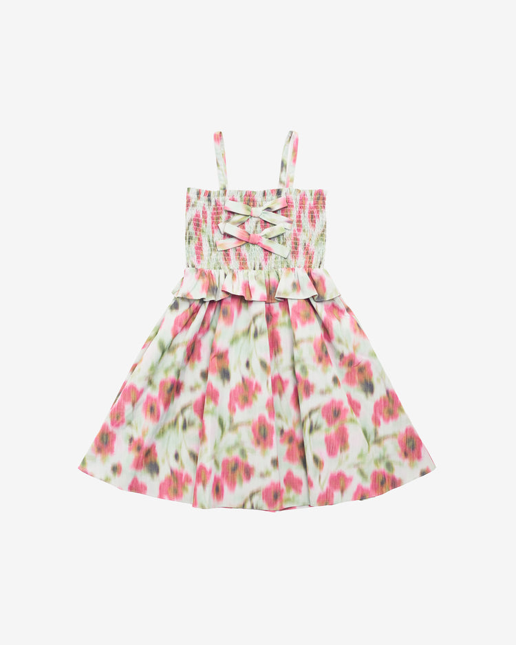 Designed in a luxe floral printed taffeta and featuring a peplum ruffle, bow detailing, and a smocked bodice, this style matches back to the adult Gigi Dress, Paige Dress, Klaire Dress, and Tavia Skirt and is available in sizes XS-L.