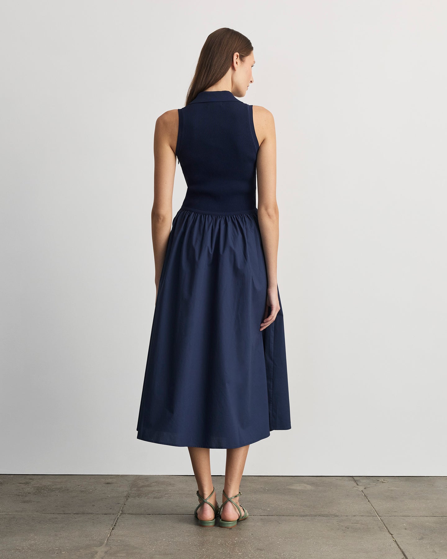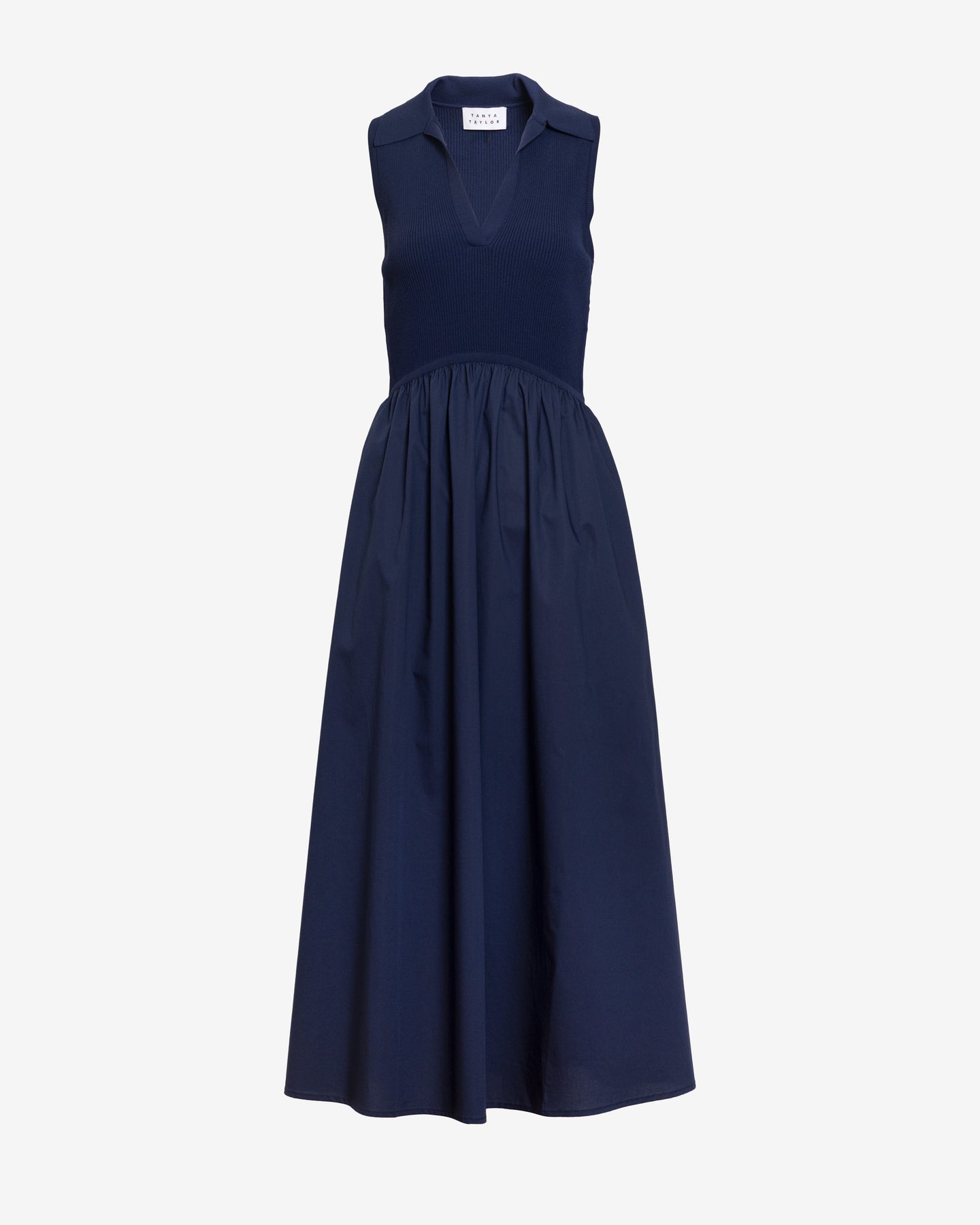 Featuring a collared v-neck knit bodice and gathered high-low waist attached to a cotton poplin skirt, the Bess Dress is an easy day-to-night silhouette that looks put-together and chic.