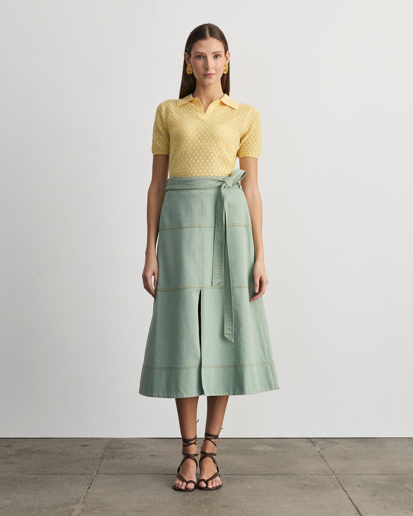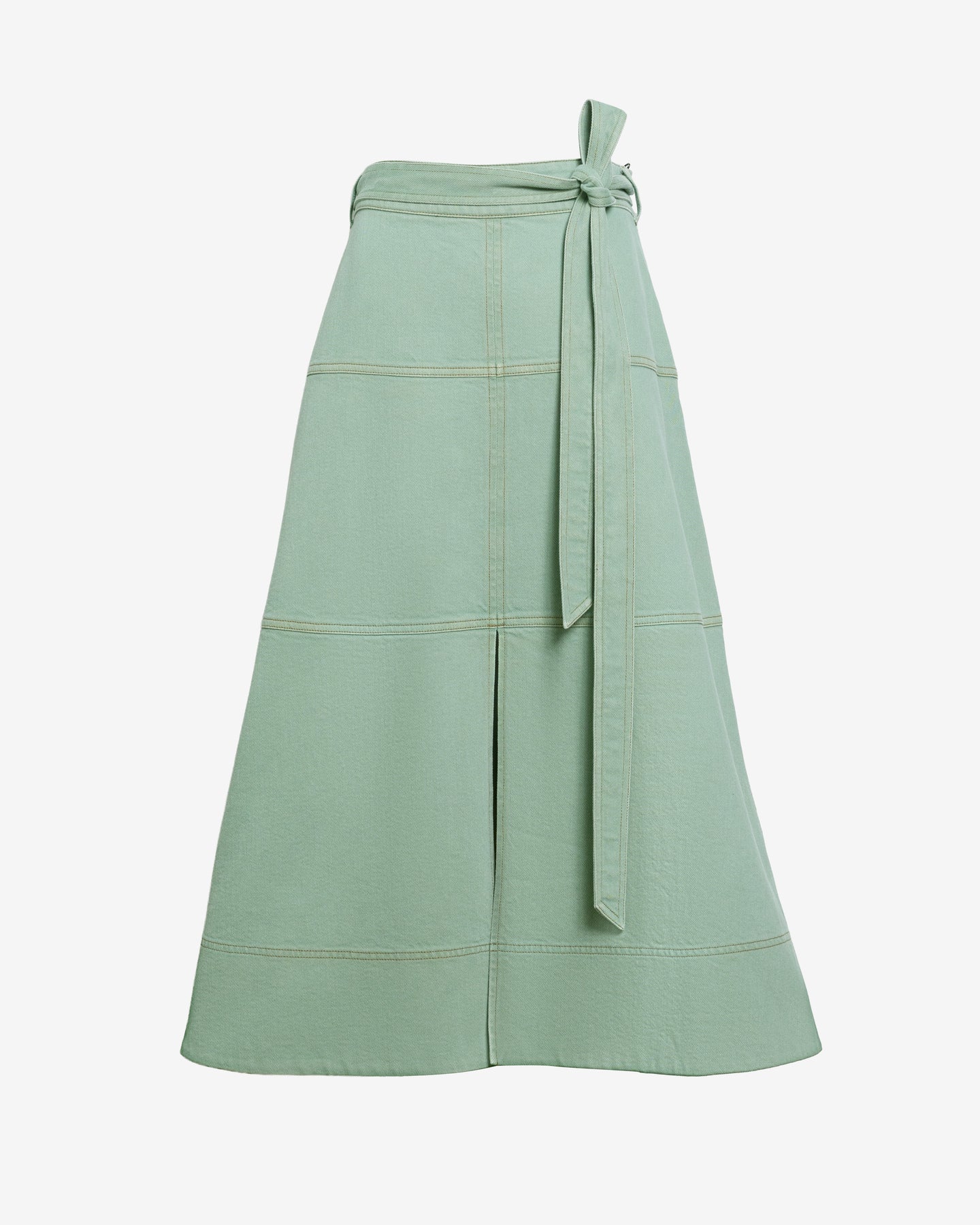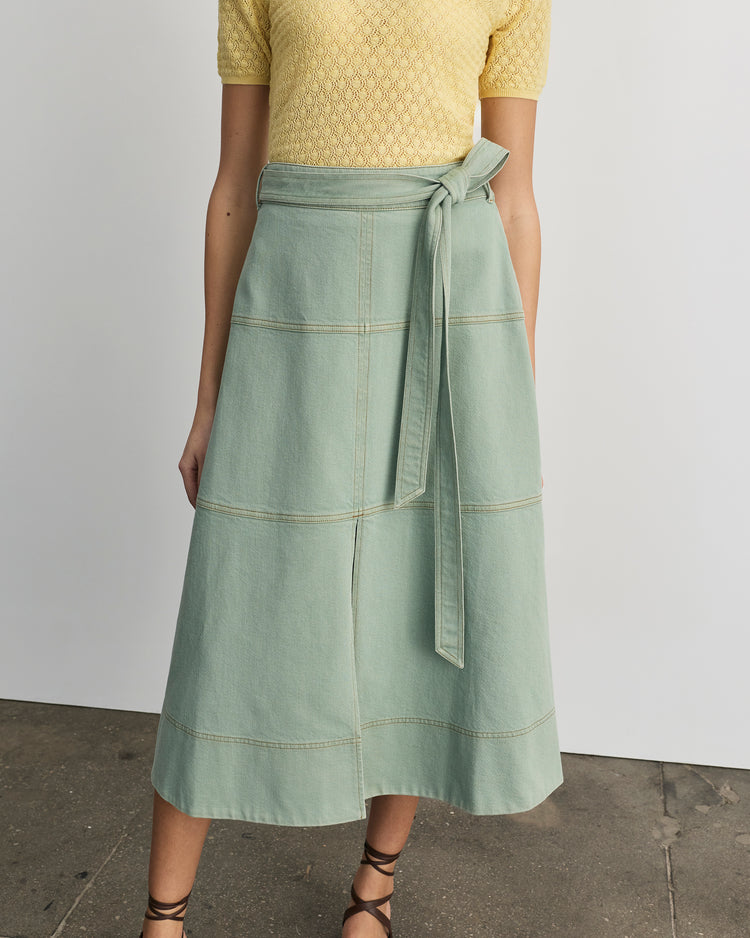 A signature silhouette and instant best-seller, the Hudley Skirt is a structural denim staple ready for Spring in a fresh pistachio colorway.