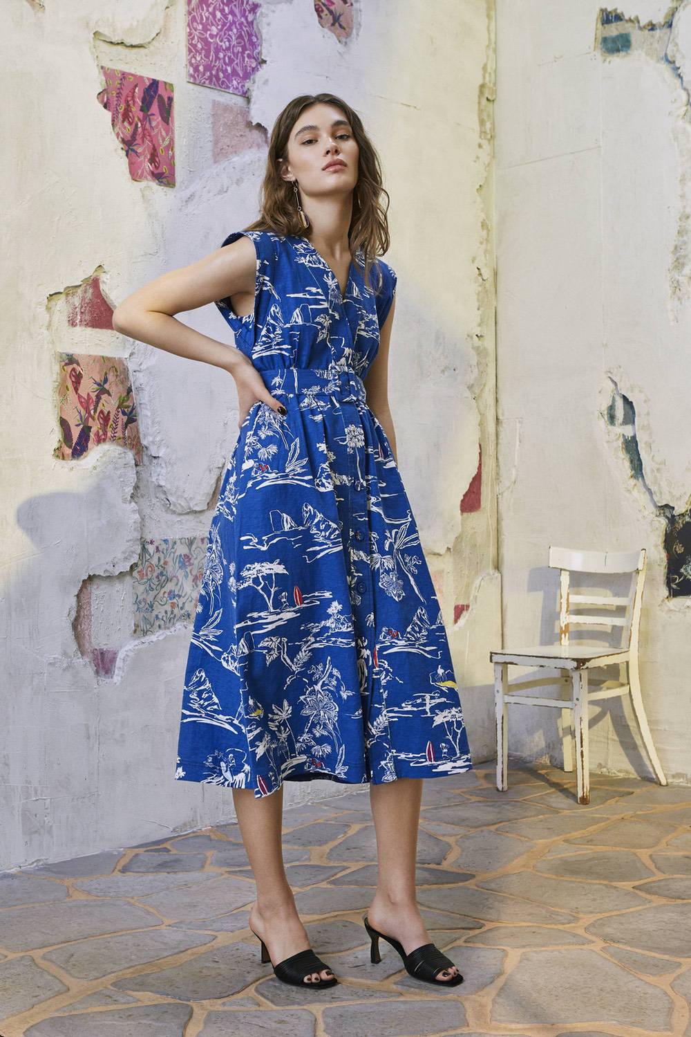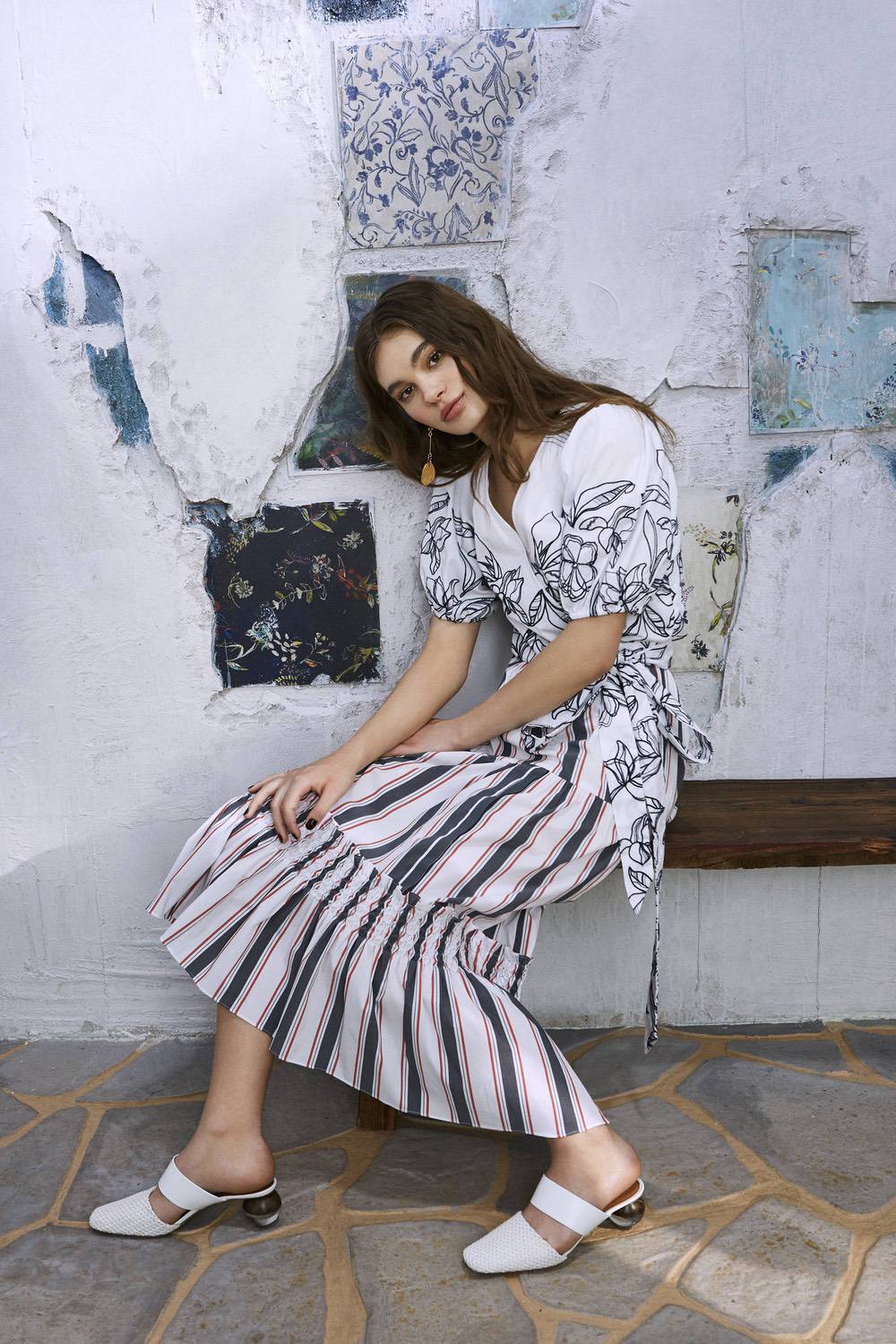Wearing printed crisp cottons in vibrant colors, she paves her own journey in the labyrinth of steep cobblestone streets. With unexpected polka dot patterns and graphic layered florals inspired by century-old tiles, our traveler conjures a newfangled perspective with polished earthy tones and sun washed hues. There is an ease in fabrics while maintaining a penchant for sophistication through washed silks and linens.