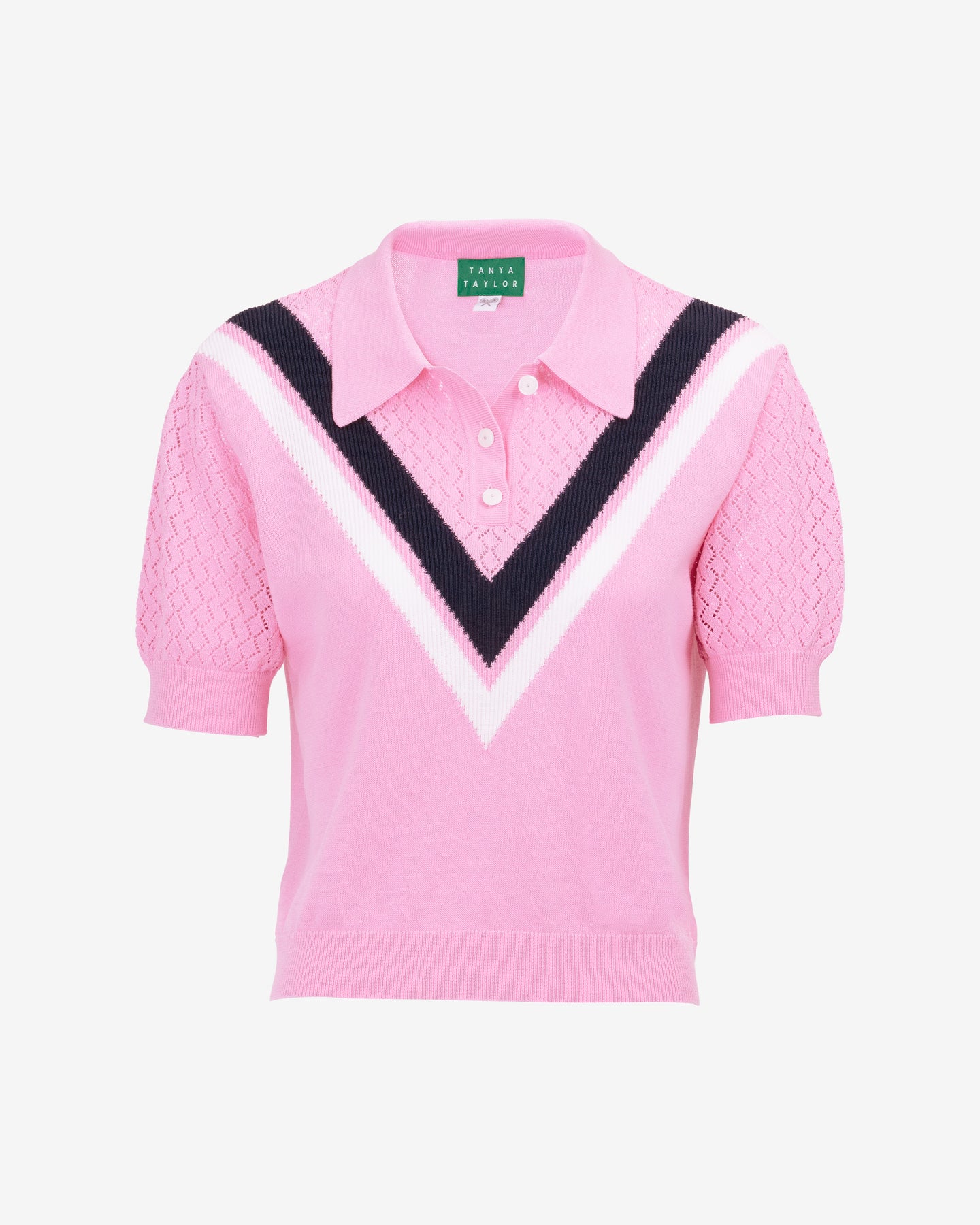 Designed with pointelle sleeves and neckline, contrasted by a preppy V-neck design, Camilla is polished yet playful, adding a touch of refined charm to your everyday rotation.