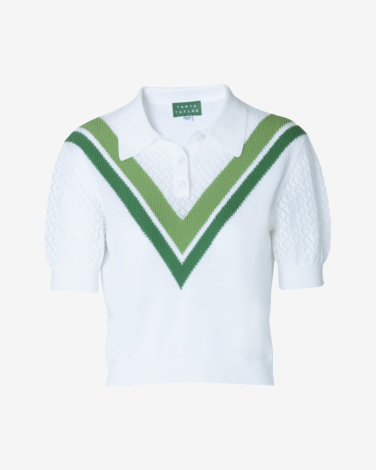 Designed with pointelle sleeves and neckline, contrasted by a preppy V-neck design, Camilla is polished yet playful, adding a touch of refined charm to your everyday rotation.