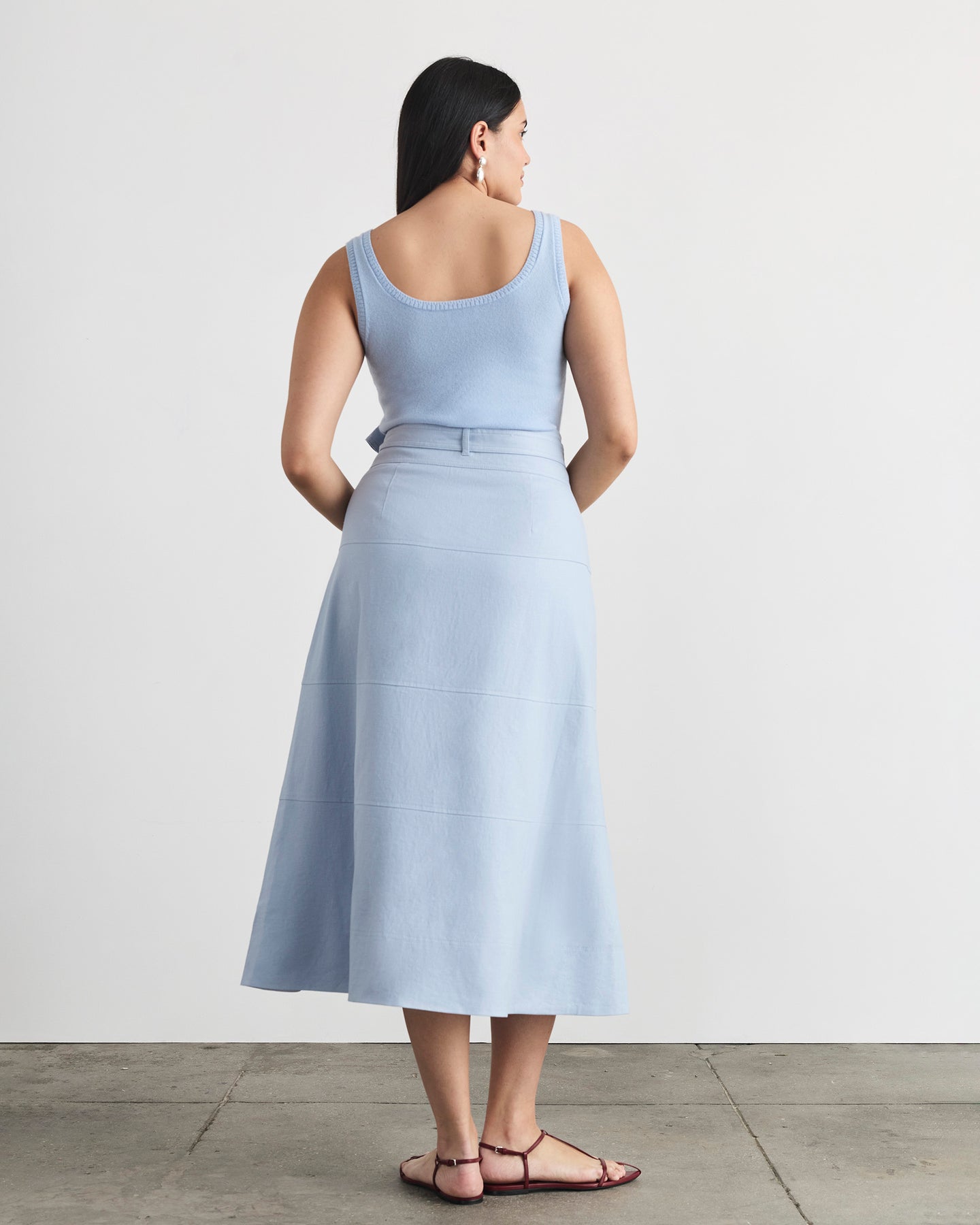 Featuring tiered seaming throughout the A-line shape and a self-tie belt for added interest, Hudson is a high-waisted silhouette with the perfect proportions in mind.